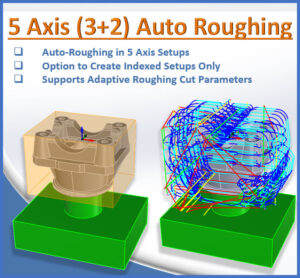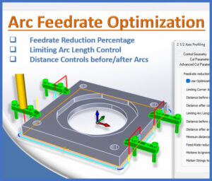 A 3 Axis Parallel Finishing operation is used with a ½” diameter flat end mill. Again the operation is contained to the perimeter boundary curve shown in the part model above. Cut Parameters include an Intol/Outtol of 0.001”, Stock allowance of 0” a Mixed cut direction, Angle of Cuts is 90 degrees and Stepover Control set to a distance of 0.06”. Entry consists of a Linear Engage motion with both Angle (A) and Length (L) set to zero which eliminates the entry motion and forces the tool to plunge directly above the cut start point. The same is true for the Linear Retract Motion. Again, Arc Fitting is enabled with a Fitting tolerance (t) of 0.002”. Cut Feed: 175 in/min, Spindle Speed: 18,500 RPM, Estimated Machining Time: 6.39 mins. Below on the left we see the part geometry and the resulting 3 Axis Parallel Finishing toolpath. The resulting cut material simulation is shown on the right.